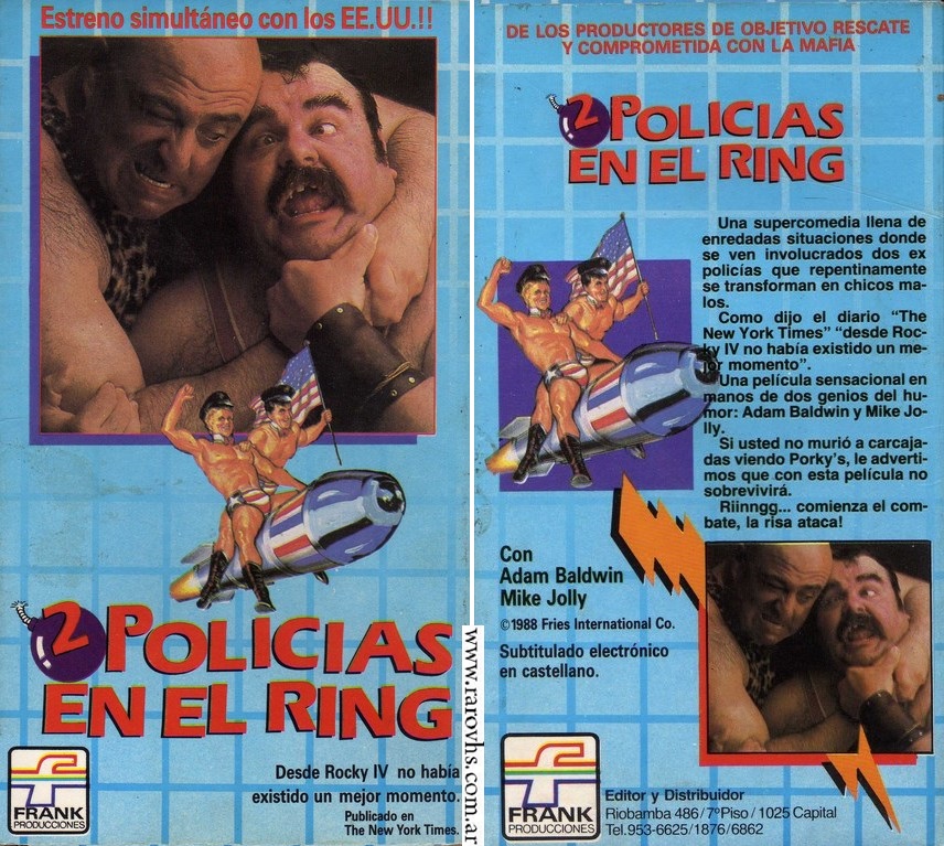 Sinopsis de la contratapa: Una supercomedia llena de enredadas situaciones donde se ven involucrados dos ex-policías que repentinamente se transforman en chicos malos. Como dijo el diario “The New York Times” “desde Rocky IV no había existido un mejor momento”. Una película sensacional en manos de dos genios del humor: Adam Baldwin y Mike Jolly. Si usted no murió a carcajadas viendo Porky’s, le advertimos que con esta película no sobrevivirá. Riinngg… comienza el combate, la risa ataca!