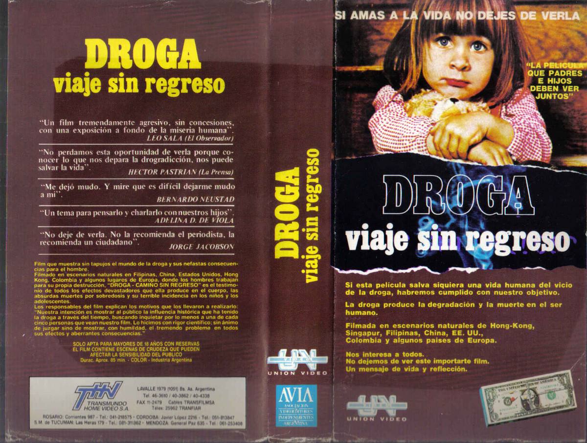 Filmado en escenarios naturales en Filipinas, China, Estados Unidos, Hong Kong, Colombia y algunos lugares de Europa, donde los hombres trabajan para su propia destrucción, «DROGA CAMINO SIN REGRESO» es el testimo nio de todos los efectos devastadores que ella produce en el cuerpo, las absurdas muertes por sobredosis y su terrible incidencia en los niños y los adolescentes.