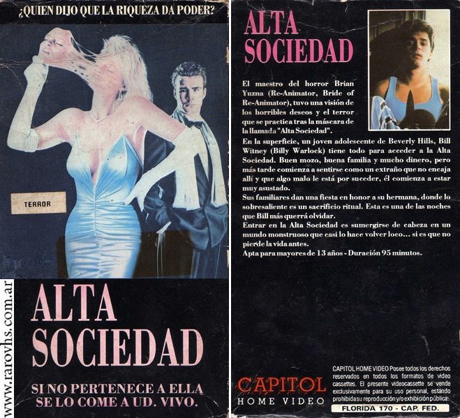 Sinopsis de la Contratapa: El maestro del horror Brian Yuzna (Re-Animator, Bride of Re-Animator), tuvo una visión de los horribles deseos y el terror que se practica tras la máscara de la llamada «Alta Sociedad». En la superficie, un joven adolescente de Beverly Hills, Bill Witney (Billy Warlock) tiene todo para acceder a la Alta Sociedad. Buen mozo, buena familia y mucho dinero, pero más tarde comienza a sentirse como un extraño que no encaja allí y que algo malo le está por suceder, él comienza a estar muy asustado. Sus familiares dan una fiesta en honor a su hermana, donde lo sobresaliente es un sacrificio ritual. Esta es una de las noches que Bill más querrá olvidar. Entrar en la Alta Sociedad es sumergirse de cabeza en un mundo monstruoso que casi lo hace volver loco… si es que no pierde la vida antes.