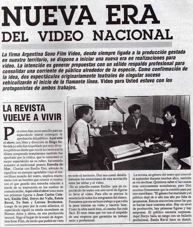 La firma Argentina Sono Film Video, desde siempre ligada a la producción gestada en nuestro territorio, se dispone a iniciar una nueva era en realizaciones para video. La intención es generar propuestas con un sólido respaldo profesional para consolidar una corriente de público alrededor de la especie. Como confirmación de la idea, dos espectáculos originariamente teatrales de singular suceso vehiculizarán el inicio de la flamante línea. Video para Usted estuvo con los protagonistas de ambos trabajos.