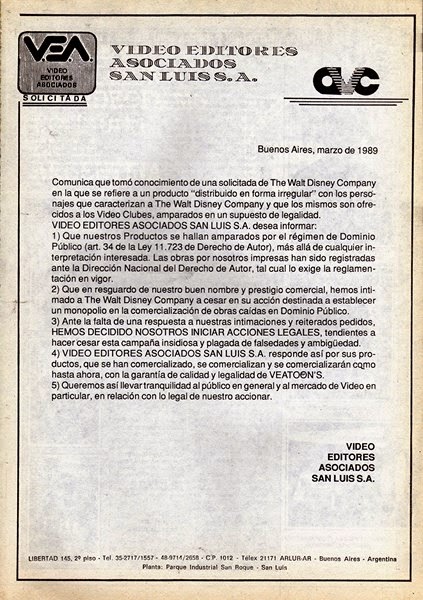 Comunica que tomó conocimiento de una solicitada de The Walt Disney Company en la que se refiere a un producto «distribuido en forma irregular» con los perso¬najes que caracterizan a The Walt Disney Company y que los mismos son ofrecidos a los Video Clubes, amparados en un supuesto de legalidad. VIDEO EDITORES ASOCIADOS SAN LUIS S.A. desea informar:1) Que nuestros Productos se hallan amparados por el régimen de Dominio Público (art. 34 de la Ley 11.723 de Derecho de Autor), más allá de cualquier interpretación interesada. Las obras por nosotros impresas han sido registradas ante la Dirección Nacional del Derecho de Autor, tal cual lo exige la reglamentación en vigor.