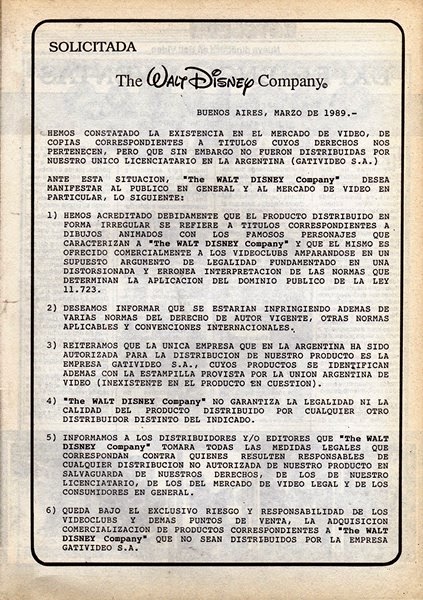 ANTE ESTA SITUACIÓN «THE WALT DISNEY COMPANY» DESEA MANIFESTAR AL PUBLICO EN GENERAL Y AL MERCADO DE VIDEO EN PARTICULAR, LO SIGUIENTE: