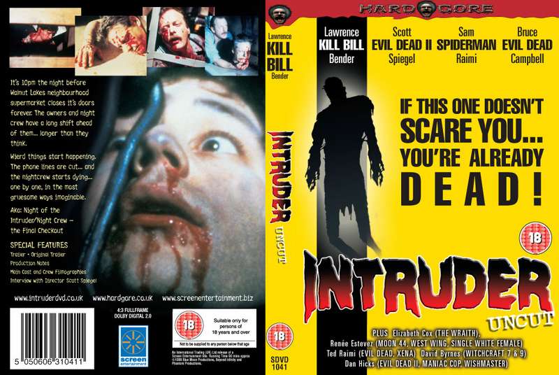 Sinopsis de la contratapa: 10 hs. p.m. El supermercado cierra sus puertas. Un incidente tiene lugar a último momento involucrando a una de las cajeras. El asedio comienza y los nervios van en aumento a medida que las terribles muertes se ponen en evidencia. Una obra maestra del horror dirigida por Scott Spiegel, «el loco de los efectos especiales». Desde su reciente estreno en cine en USA, EL INTRUSO se ha transformado en objeto de culto por los fans del cine de terror.