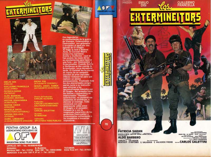 Texto de la contratapa: Dos legendarios ex combatientes de la guerra de Vietnam, Extermineitor y Destroceitor, son golpeados y arrojados al agua por los dos agentes de El Dragón. Al llegar la nave a Buenos Aires, El Coronel Morris toma a los marineros Emilio y Guillermo -que se han puesto la ropa de los ex-combatientes para hacerse una foto- por Destroceitor y Extermineitor. Cuando Emilio y Guillermo se dan cuenta de la confusión, ya es demasiado tarde. El coronel los ha puesto en manos de un campeón mundial de artes marciales (Héctor Echavarría) para que realicen un severo entrenamiento. Finalizado ésto los dos aterrorizados amigos parten juntos a la intrucción para eliminar a los narcotraficantes liderados por El Dragón. Así, armados hasta los dientes y convertidos en improvisados «Rambos» contribuirán, no obstante sus disparates de antihéroes, a derrotar al enemigo. Todo culminará con una espectacular pelea entre El Dragón y el campeón Echavarría y con la inesperada reaparición de los auténticos Destroceitor y Extermineitor enfrentando a los simpáticos e inocentes impostores.