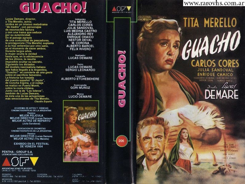 Sinopsis de la Contratapa: Lucas Demare, director, y Tita Merello, actriz; unidos en un intenso melodrama “de madre”, con personajes de reconocible factura y con una trama que seduce por su autenticidad. En el paisaje agreste de una comunidad de pescadores, la protagonista (Tita Merello) suplanta a su hijo enfermizo por otro sano, en el momento de nacer ambos. Durante largos años, la mujer oculta la verdad hasta que, en la adolescencia de los chicos, le resulta imposible ocultar su secreto. Siguiendo los dictados del modelo neorrealista italiano que había llegado a la Argentina, “Guacho!” se convierte en una gesta sobre el sacrificio femenino. La historia fue tomada del cuento español “El Jayón”, de Concha Espina, y el rodaje se realizó en Puerto Montt, sobre la costa chilena.