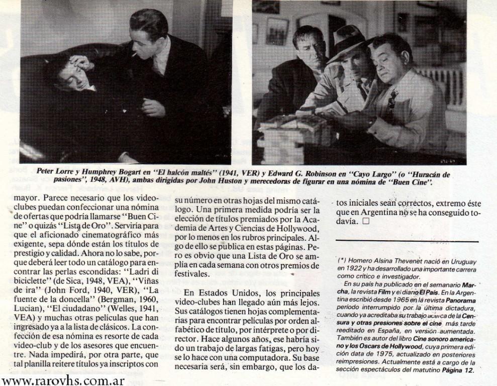 Corresponde agregar una observación mayor. Parece necesario que los video-clubes puedan confeccionar una nómina de ofertas que podría llamarse » Buen Cine» o quizás «Lista de Oro». Serviría para que el aficionado cinematográfico más exigente, sepa dónde están los títulos de prestigio y calidad. Ahora no lo sabe, porque deberá leer todo un catálogo para encontrar las perlas escondidas: «Ladri di biciclette» (de Sica, 1948, VEA), «Viñas de ira» (John Ford, 1940, VER), «La fuente de la doncella» (Bergman, 1960, Lucían), «El ciudadano» (Welles, 1941, VEA) y muchas otras películas que han ingresado ya a la lista de clásicos. La confección de esa nómina es resorte de cada video-club y de los asesores que encuentre. Nada impedirá, por otra parte, que tal planilla reitere títulos ya inscriptos con su número en otras hojas del mismo catálogo. Una primera medida podría ser la elección de títulos premiados por la Academia de Artes y Ciencias de Hollywood, por lo menos en los rubros principales. Algo de ello se publica en estas páginas. Pero es obvio que una Lista de Oro se amplía en cada semana con otros premios de festivales.