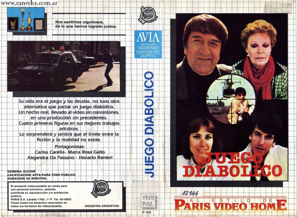 Juego diabólico es una producción nacional realizada exclusivamente para video por una productora independiente, que muestra una historia con características policiales y, lo que es su rasgo más sorprendente, con resonancias oníricas y fantásticas. El joven actor televisivo Horacio Ranieries un ladrón que decide realizar un “trabajito” más: asaltar una institución bancaria. Hasta ahí, todo es normal, y la narración, sólo en apariencia, se circunscribiría, a un relato pasatista y proclive al tantas veces emitido por series de televisión. Sin embargo, la “vuelta de tuerca” de la historia, sumerge al personaje central en una metódica locura, al ser absorbido por diferentes “flashbacks” que le recuerdan lo vivido y que lo acosan para extraerle su culpabilidad. Comienzan a aparecérsele, una serie de personajes hasta ese momento inimaginados, los que, poco a poco, sorprenderán al ladrón de marras, hasta que éste no diferencie los delgados límites de la fantasía y de la realidad. Un elenco de primeras figuras prestigia esta primera producción de una editora independiente, al fin y al cabo, un «thriller” con ribetes metafísicos y oníricos en medio de una historia, engañosamente convencional y trillada. Bienvenida sea, esta propuesta de París Video Home en apoyo de una manifestación artística nacional.