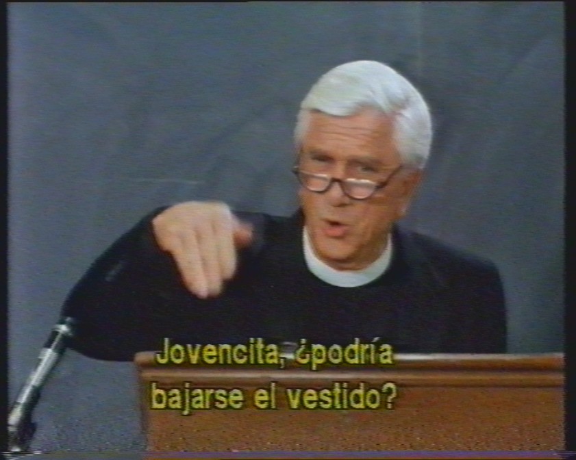 Contratapa Leslie Nielsen, el mismo que lo hizo reir con «La Pistola Desnuda 1 y 2 1/2, esta vez encarna a Jedidiah May III, un clérigo exorcista. Sólo él dispone de todos los poderes necesarios para hacer de ésta una historia disparatada. Y en dónde pretenderá «salvar» a Nancy Aglet (Linda Blair) del «demonio» que la posee. Aunque, en realidad, de quien habrá que salvarse será de ellos. De la poseída y del exorcista.