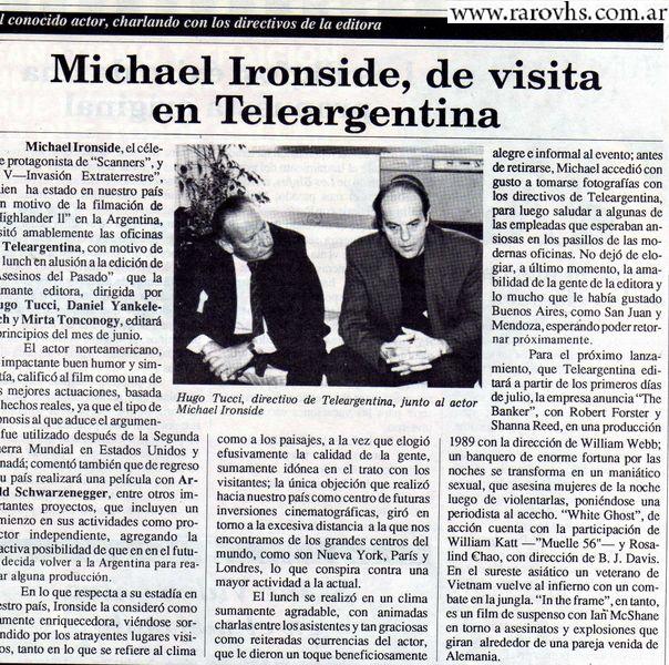 Michael Ironside, el célebre protagonista de «Scanners», y “V Invasión Extraterrestre», quien ha estado en nuestro país n motivo de la filmación de “Highlander II» en la Argentina, visitó amablemente las oficinas Teleargentina, con motivo de lunch en alusión a la edición de “Asesinos del Pasado» que la flamante editora, dirigida por Hugo Tucci, Daniel Yankelevich y Mirta Tonconogy, editará a principios del mes de junio.