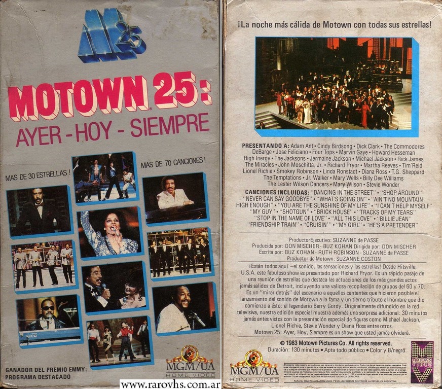¡Están todos aquí -el sonido, las sensaciones y las estrellas! Desde Hitsville, U.S.A. este fabuloso show es presentado por Richard Pryor. Es un rápido pasaje de una reunión de estrellas que destaca las actuaciones de los más grandes actos jamás salidos de Detroit, incluyendo una valiosa recopilación de grupos del 60 y 70. Es un «mirar detrás» del escenario a aquellos cantantes que hicieron posible el lanzamiento del sonido de Motown a la fama y un tierno tributo al hombre que dio comienzo a ésto: el legendario Berry Gordy. Originalmente difundido en la red televisiva, nuestra edición especial muestra además una sorpresa adicional: 30 minutos jamás antes vistos con la presentación especial de figuras como Michael Jackson, Lionel Richie, Stevie Wonder y Diana Ross entre otros. Motown 25: Ayer, Hoy, Siempre es un show que usted jamás olvidará. © 1983 Motown Pictures Co. All rights reserved. Duración: 130 minutos – Apta todo público – Color y b/negro