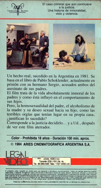 Texto de la Contratapa: Un hecho real, sucedido en la Argentina en 1981. Se basa en el libro de Pablo Schoklender, actualmente en prisión, con su hermano Sergio, acusados ambos del asesinato de sus padres. El film trata de la vida absolutamente inmoral de sus padres, y como influyó en el comportamiento de sus hijos. Pero, la homosexualidad del padre, el alcoholismo de la madre y su deseo sexual hacia su hijo, como las terribles orgías que tenían lugar en su propia casa, ¿justifican lo sucedido?. Júzguelo después de ver este film aterrador.