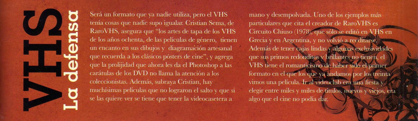 Será un formato que ya nadie utiliza, pero el VHS tenía cosas que nadie supo igualar. Cristian Sema, de RaroVHS, asegura que “los artes de tapa de los VHS de los años ochenta, de las películas de género, tienen un encanto en sus dibujos y diagramación artesanal que recuerda a los clásicos pósters de cine”, y agrega que la prolijidad que ahora les da el Photoshop a las carátulas de los DVD no llama la atención a los coleccionistas. Además, subraya Cristian, hay muchísimas películas que no lograron el salto y que si se las quiere ver se tiene que tener la videocasetera a mano y desempolvada. Uno de los ejemplos más particulares que cita el creador de RaroVHS es Circuito Chiuso (1978), que sólo se editó en VHS en Grecia y en Argentina, y no volvió a reeditarse. Además de tener cajas lindas y algunas exclusividades que sus primos redonditos y brillantes no tienen, el VHS tiene el romanticismo de haber sido el primer formato en el que los que ya andamos por los treinta vimos una película. Ir al videoclub era una fiesta y elegir entre miles y miles de títulos, nuevos y viejos, era algo que el cine no podía dar.
