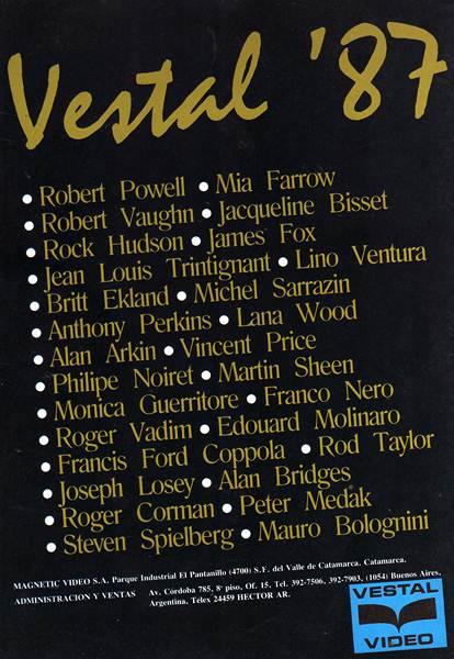 Vestal cuenta en la actualidad con un elenco de siete vendedores, ‘tres de los cuales van a estar constituidos en forma permanente en el interior del país, contando con toda la panoplia de desarrollo de producto que consideramos será necesaria para el 87’. El acuerdo con Cinematográfica Estrella, finalmente, prevé el lanzamiento, desde mayo a junio, del material de esta empresa, que comprende títulos como ‘Cours Privé’; ‘High Season’, con James Fox y Jacqueline Bisset; ‘Race to danger’, protagonizada por el italiano Franco Ñero; Prétty smart’ ; ‘Vacaciones separadas’ y ‘Slam dance’.